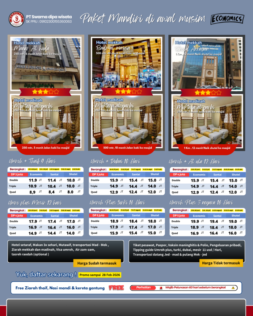 Kalau kamu mau buat paket secara reques bisa hubungi kami, nanti kami bantu untuk hitungkan kebutuhan biaya perjalanan umrohmu, pasti hemat, aman dan menyenangkan